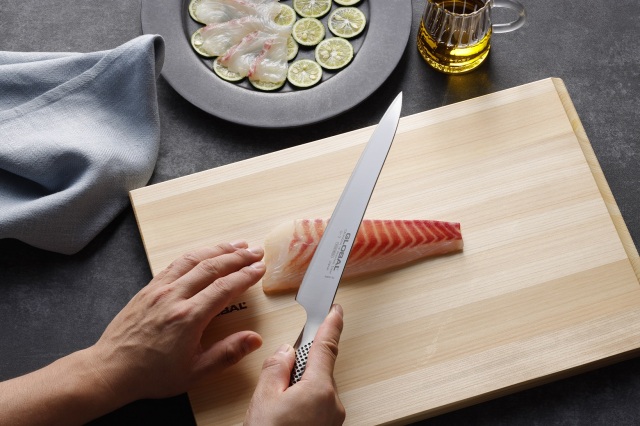 また、長くスリムな刀身を活かして、刺身を引くための包丁である柳刃包丁のような使い方もできます。一般的な柳刃包丁は片刃のため、砥石でのメンテナンスが必要ですが、G-3は両刃でGLOBALシリーズのシャープナーも使えるため、砥石のハードルが高いという方にもおすすめです。