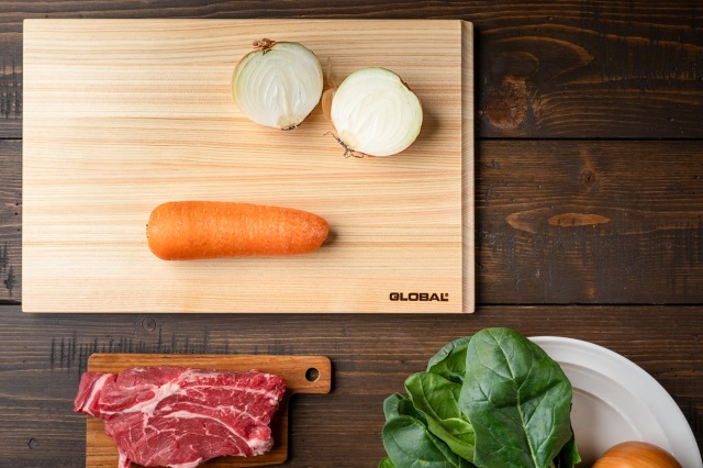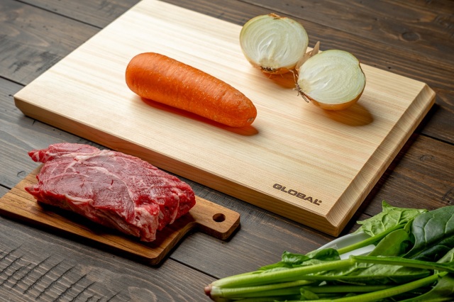 包丁とその刃を受けるまな板は、切っても切り離せない重要なパートナー。硬い素材や薄すぎるまな板は、食材を切った衝撃が手や刃に伝わりやすく、刃こぼれや切れ味低下を早める原因になることもあります。GLOBALカッティングボードMediumは、日常使いにちょうどいいサイズ感で、野菜から肉・魚まで幅広く対応できるバランスの取れたまな板です。 また刃のあたりが柔らかいヒノキ(国産)を使用し、快適な包丁仕事をサポートします。